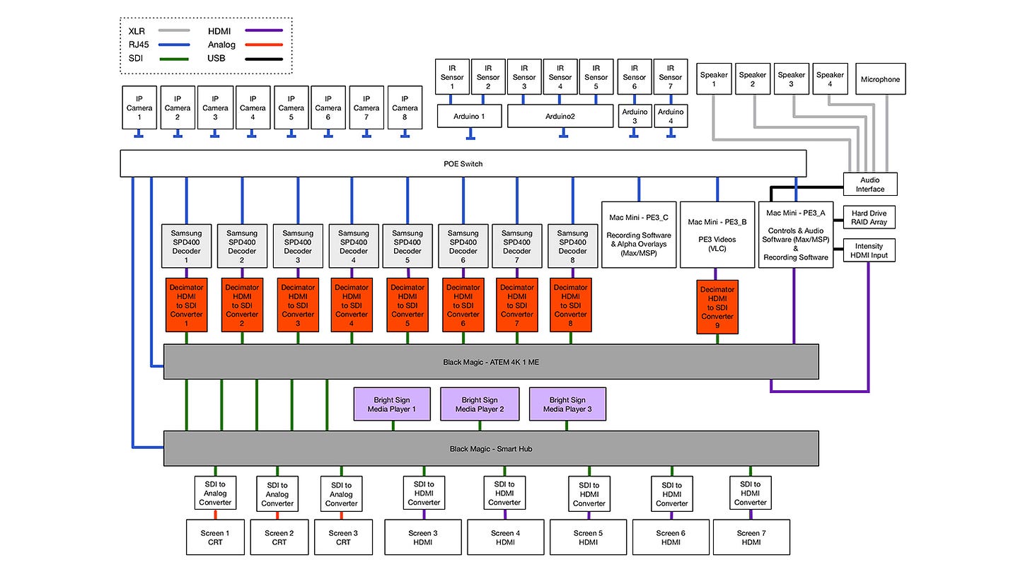 Julia and I collaborated remotely for nearly a year, across time zones, across disciplines, and often across languages of intent. She would describe moods and concepts, metaphors and feelings. I would interpret those into camera placement schematics, data routing diagrams, and custom-built software. After 11 months of digital collaboration, we meet in person to bring the physical space to life. This was not a typical artist-technologist relationship; it was a living, breathing negotiation between vision and feasibility, aesthetics and circuitry. We didn’t just build a system—we co-composed an environment.